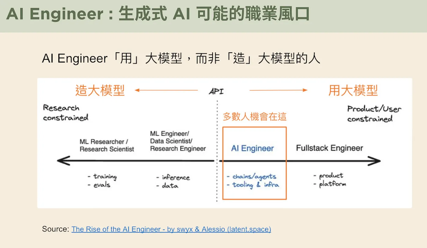 對大部分資源較少的公司來說,能自己訓練大模型的機會非常少,所以如何善用訓練好的大模型,就變成一個很重要的技能,這正是 AI Engineer 的核心價值所在。這個角色要能夠調用不同大模型 API 的接口、把它們串接到實際產品或流程中。