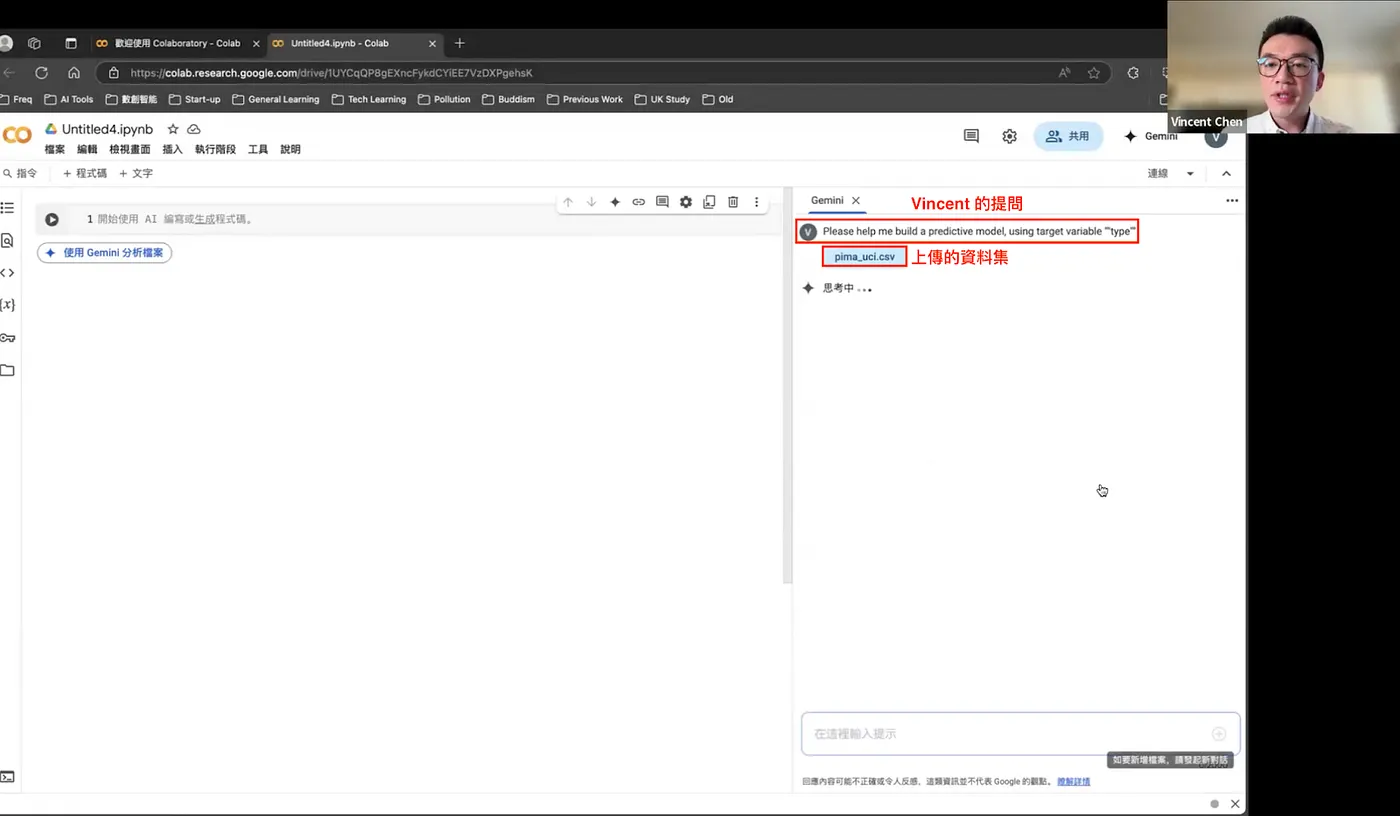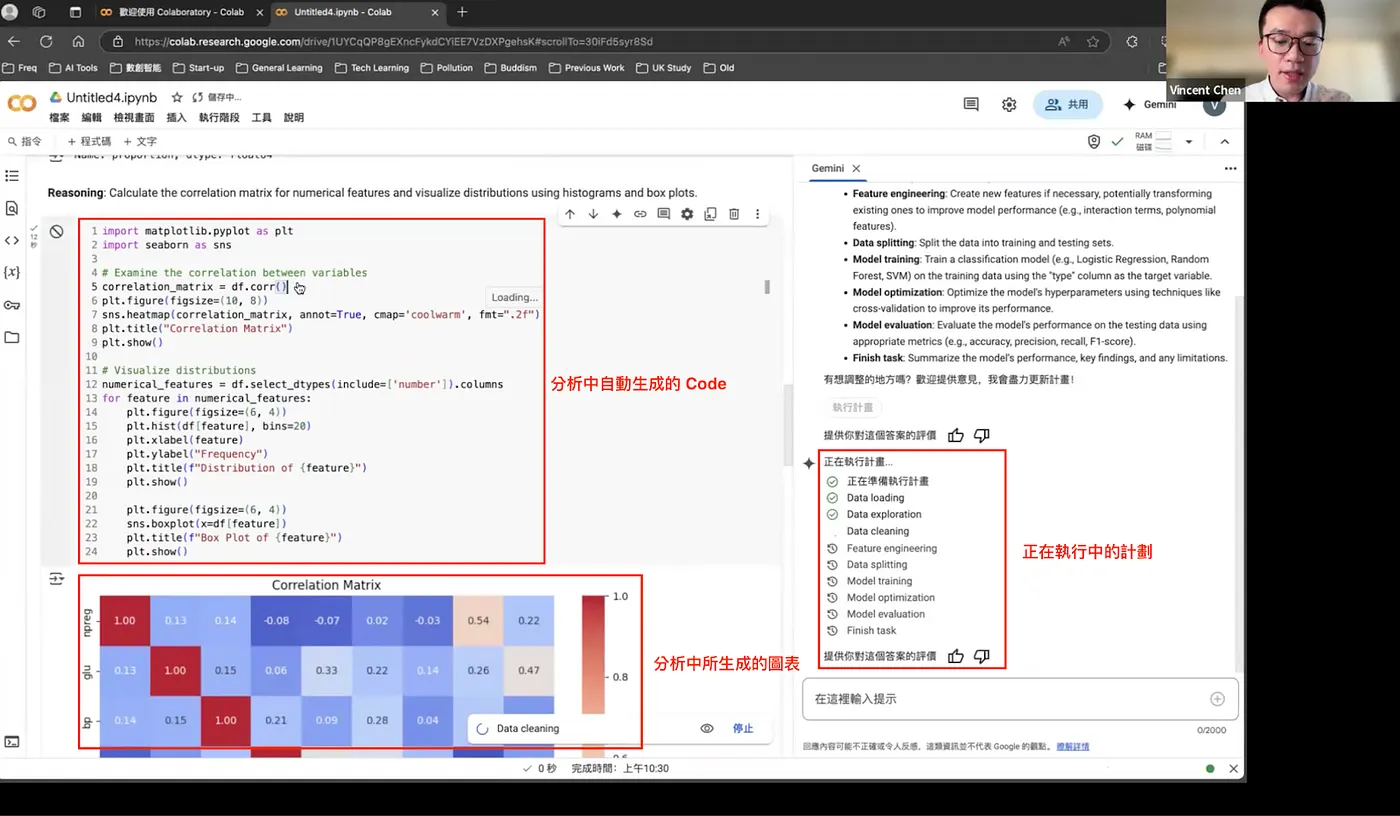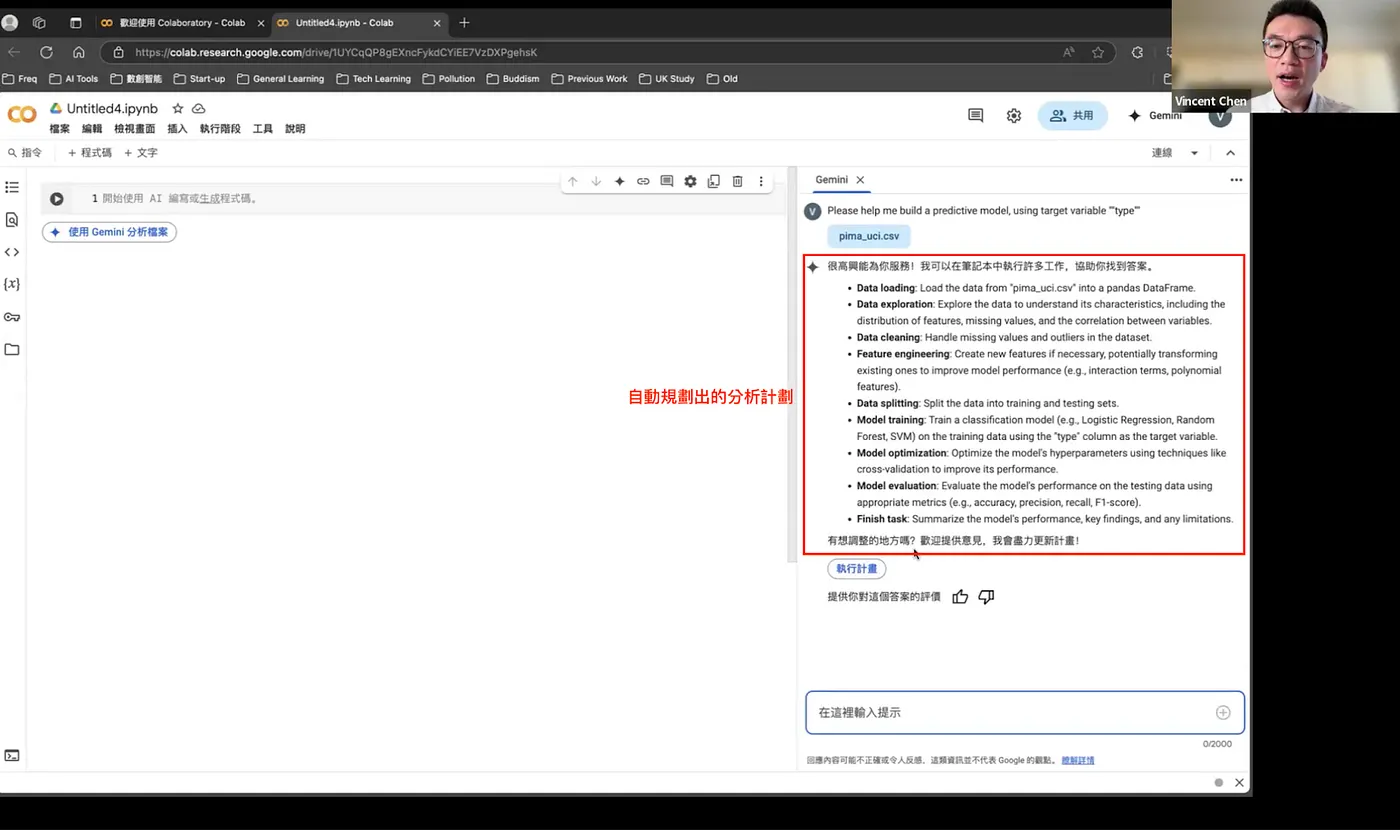 Vincent 先向我們展示了Google 近期推出的 Data Science Agent,這個 AI Agent 高度自動化資料工作流程,Vincent 展示將一個資料集上傳至 Google Colab,並使用 Data Science Agent (Powered by Gemini) 來分析該資料,在 Demo 中 (請參考以下精選截圖)可以看到 Data Science Agent 自動規劃出分析計畫,等待使用者確認後,Agent 就會自己開始執行分析,從資料探索、資料清理、特徵工程到訓練模型,所有過程中生成的 Code 都會寫入到 Colab 的 Jupyter Notebook,過程中間使用者也都可以打斷並插手介入分析。