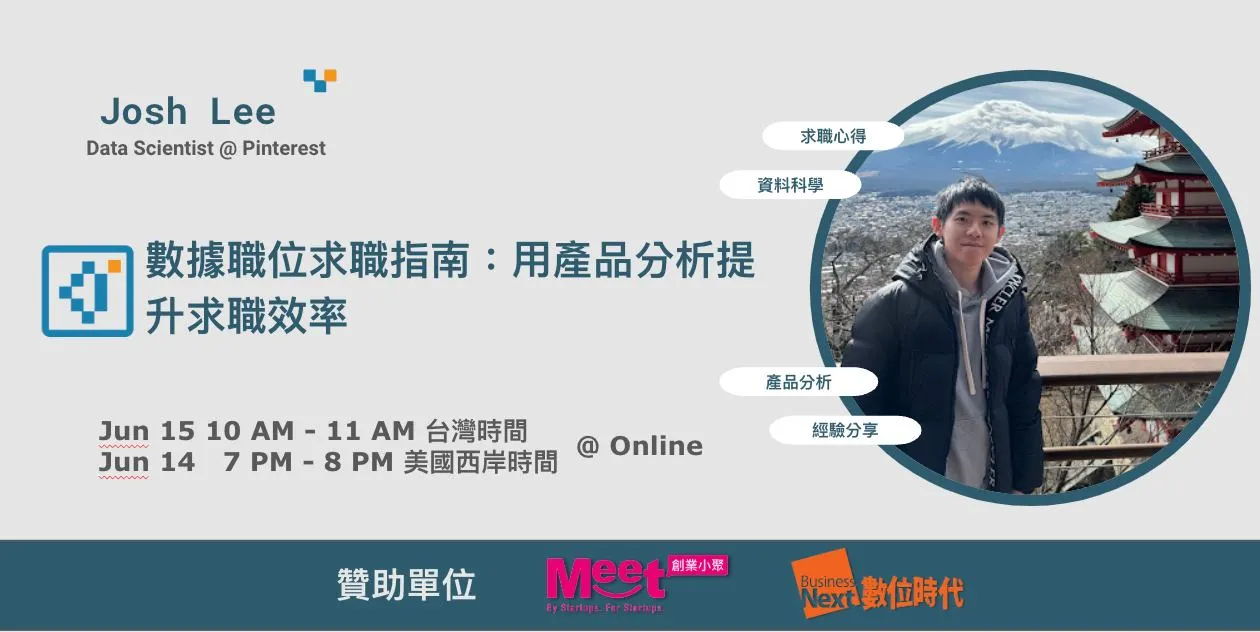 今天分享的主題是:數據職位求職指南,內容來自於講者在美國求職的經驗&與其他求職者的交流,用產品分析的方式提升求職效率,包括找工作的策略,以 Case Study 的方式分享給大家,如何從中分析出自己的優勢與弱勢,接著採取行動,找到自己最想要的數據工作。