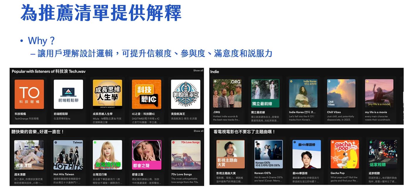 Spotify 從使用者的研究發現,為推薦清單提供解釋的話,可以讓理解他們為什麼要設計這樣的列進而提升用戶對這個推薦系統的信賴度、參與度、滿意度跟說服力,進而促進點擊