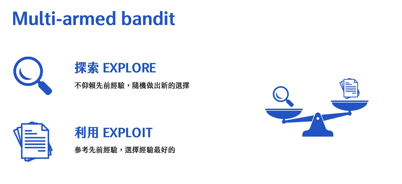 - 大家在玩拉霸機或是吃角子老虎機的時候,可以拉不同的手臂,並得到不同的獎勵,選擇要拉哪一個手臂時,可能會根據過去的經驗來決定,例如說拉這個比較容易得到獎勵,或者拉這隻臂都沒有得到獎勵,所以不拉它,因此每一次拉臂之前,可以參考過去的經驗,或者拉一個全新的臂。