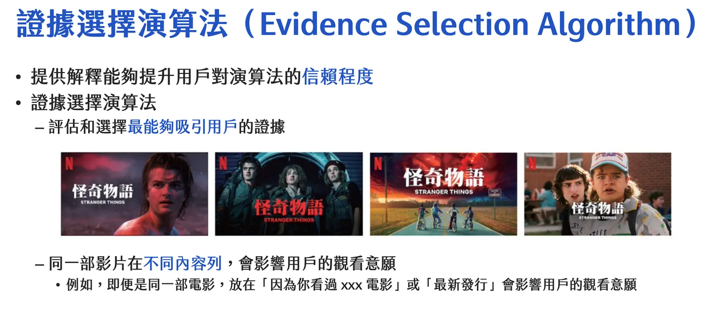 不同縮圖的部分,如下圖所示,同樣一部「怪奇物語」,就有 4 種縮圖,會根據每個人的 profile,預測哪一個縮圖更可能促使使用者點擊,例如有的人喜歡看奧斯卡得獎的影片,同樣一部影集,就會給予有奧斯卡得獎的縮圖,或者有的人更傾向點擊風格陰暗,又或者縮圖演員表情中較為豐富的縮圖。