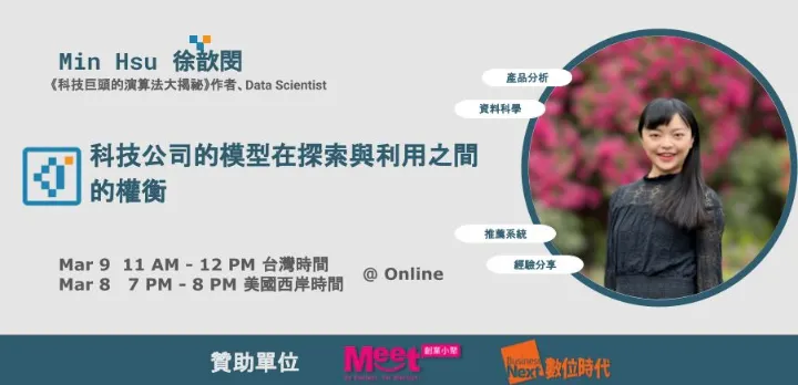 Shin-Min Hsu 台大學碩畢業,目前在資安公司擔任 Data Scientist,參與了2022 iThome 鐵人賽,隨後出版了【科技巨頭演算法大揭密】,本次主題會聚焦在科技巨頭 — Spotify 以及 Netflix 的推薦系統演算法,特別在於探索和利用之間的權衡。