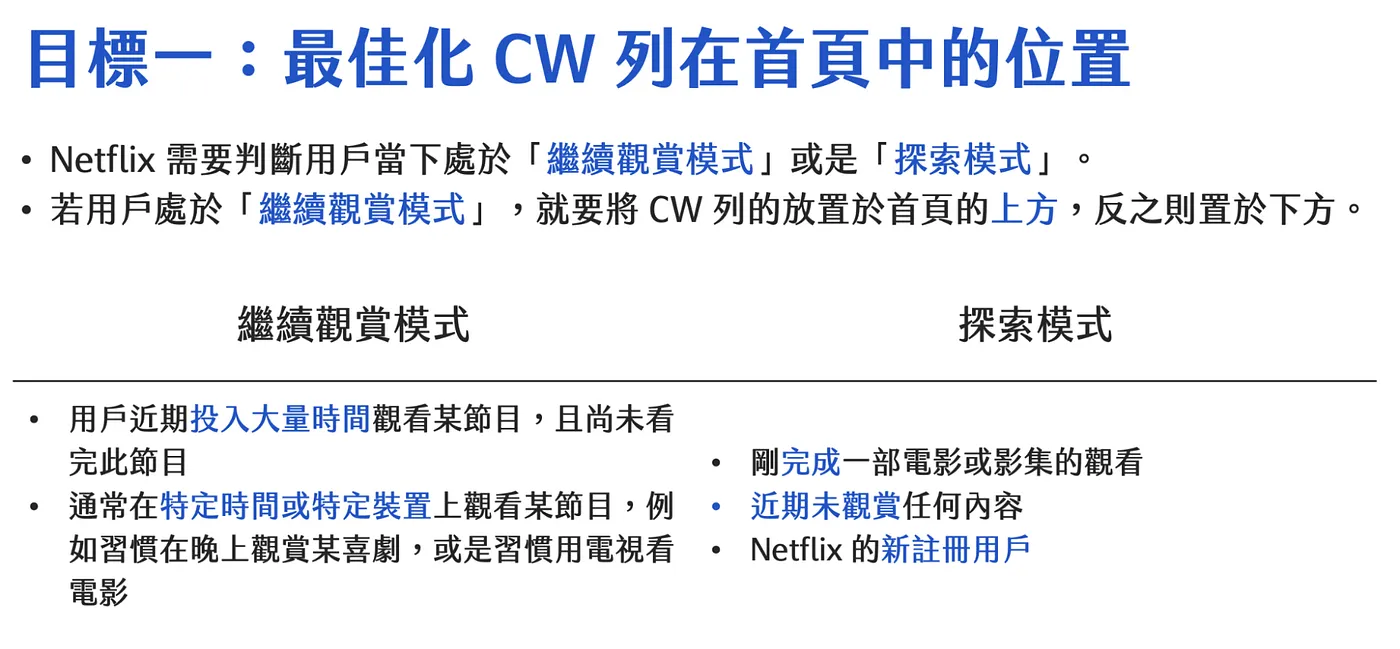 因此特別閱讀了 Netflix 的相關文獻,根據資料分析結果, Netflix 將使用者切成兩種行為模式,探索模式以及繼續觀看模式 (追劇模式)