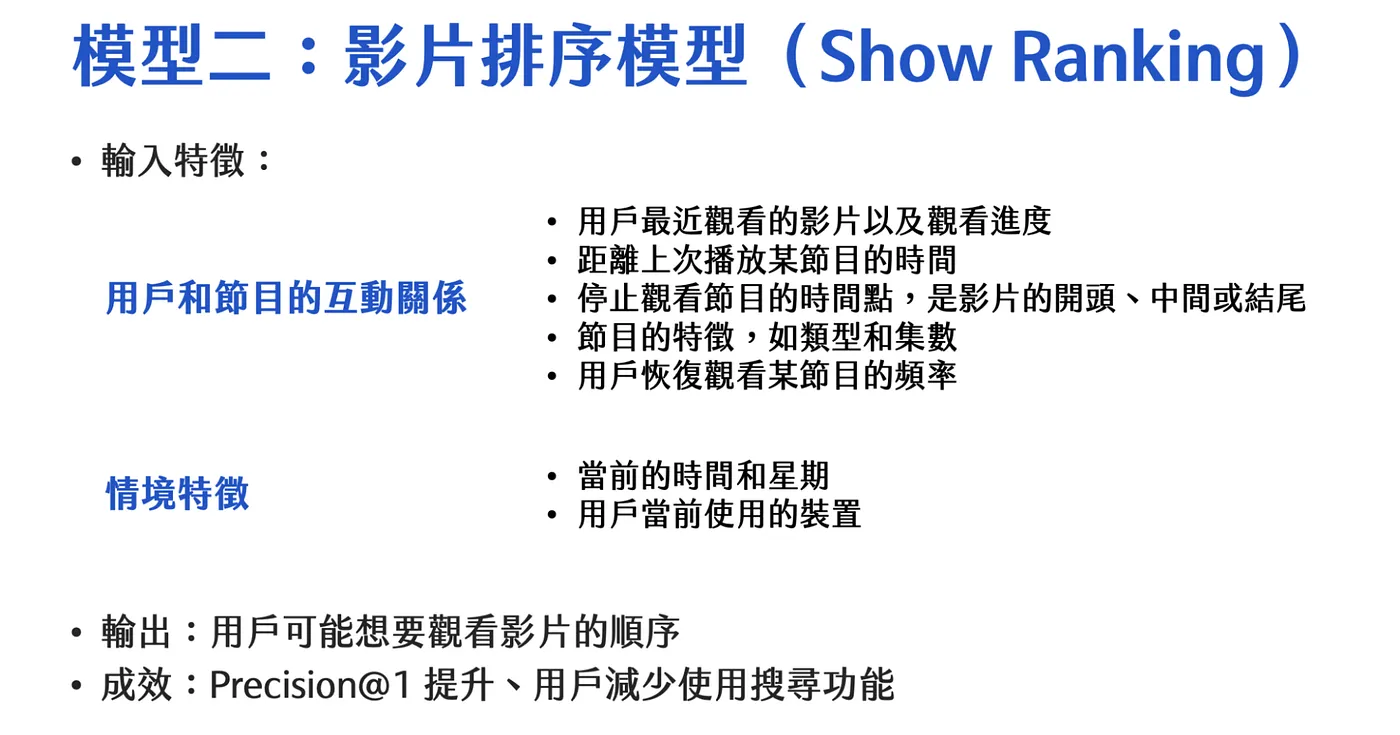 「繼續觀賞」的內容排列也會和 Context 有關係,最明顯的則是時間與裝置,例如在通勤時間,可能傾向看時間長度短的劇,並且使用手機,而晚上回到家用電視,則會選擇看不同的影集,這也可以被做成一個排序模型,來計算已經看過的影集,根據目前的使用者行為,哪個影集是最有可能被觀看的。