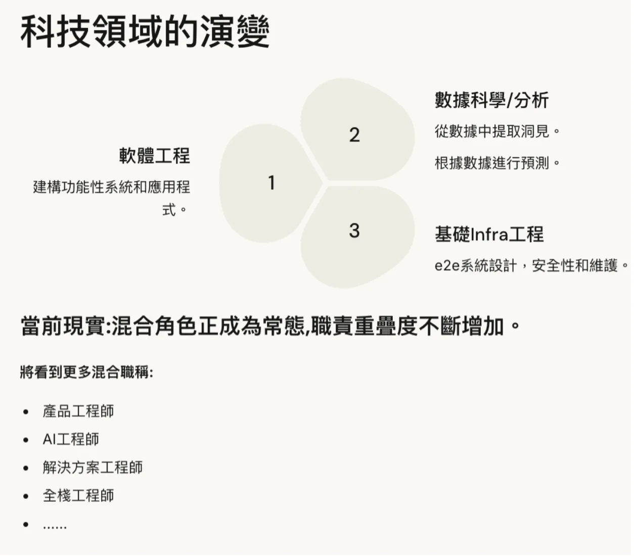 講者認為,所以如果你願意多方位地去發展技能,我覺得你就可以直接挑戰這類型的職位。像現在的 AI Engineer,有時候也叫 AER — — AI Application Engineer。其實就是三個技能都要懂一點。Product Engineer 也是一樣的道理。你是那種能夠 Build Product 的 Engineer,那你就是每一環都得懂一點。
