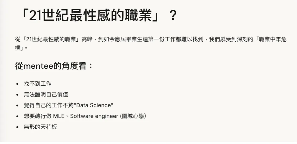 在講者的觀察中,許多資料科學領域的從業者,無論是剛畢業的新人或已經在職場上的開始有經驗的工作者,都在不同階段面臨困境。對於剛畢業的學生而言,進入這個產業的門檻變得越來越高,第一份工作難以尋覓,不少原本積極尋求轉職的 Mentee,最後選擇沉默或轉行。