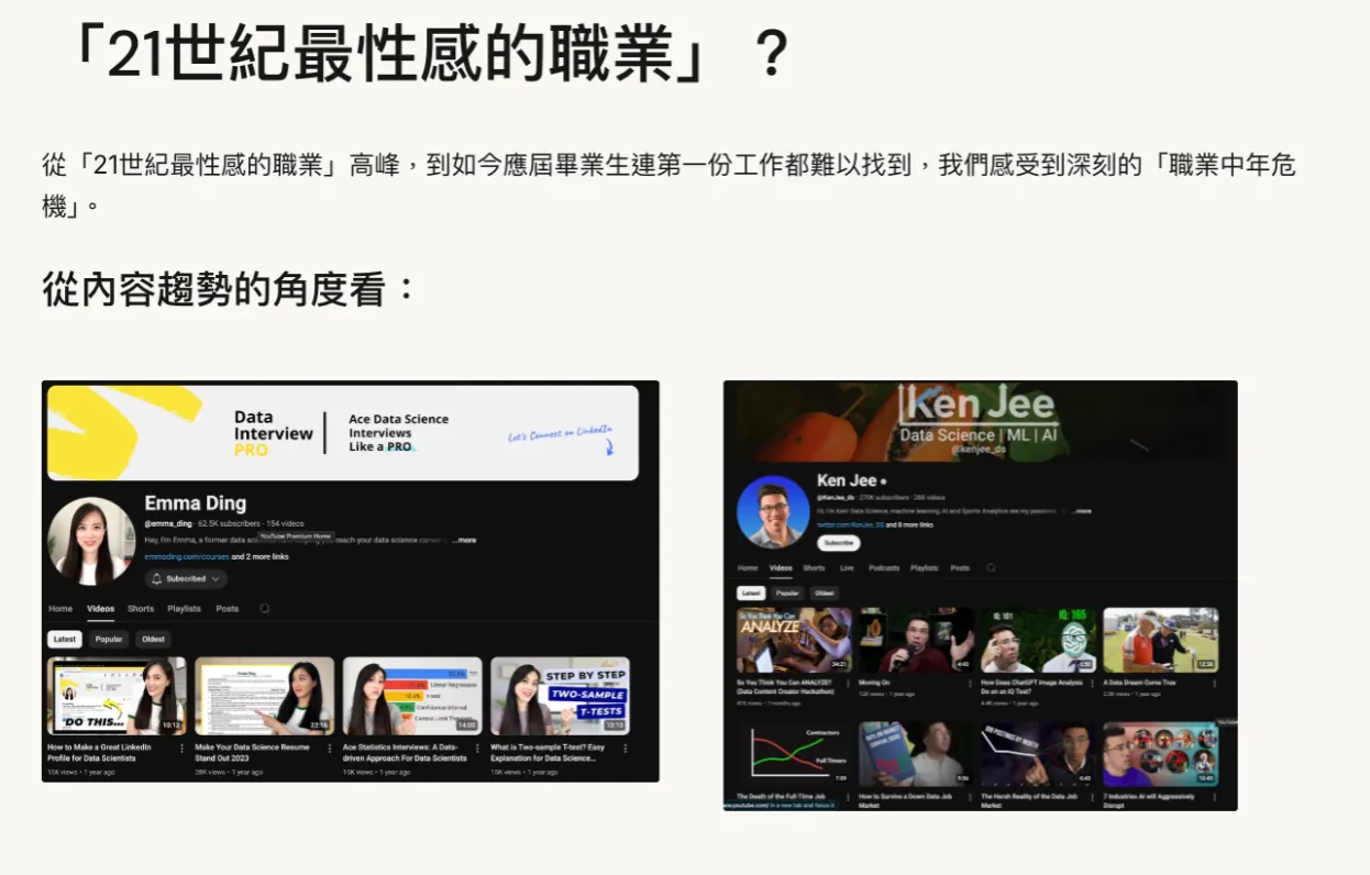 講者剛出社會的階段,如 Emma Ding, Ken Jee 等 Data Science 網紅給予他很大的幫助,然而這些 Youtuber 年多前都停更了,講者的生活中也發現,目前 Data Science 的教學/面試攻略等 Youtube 資訊也呈現下滑趨勢