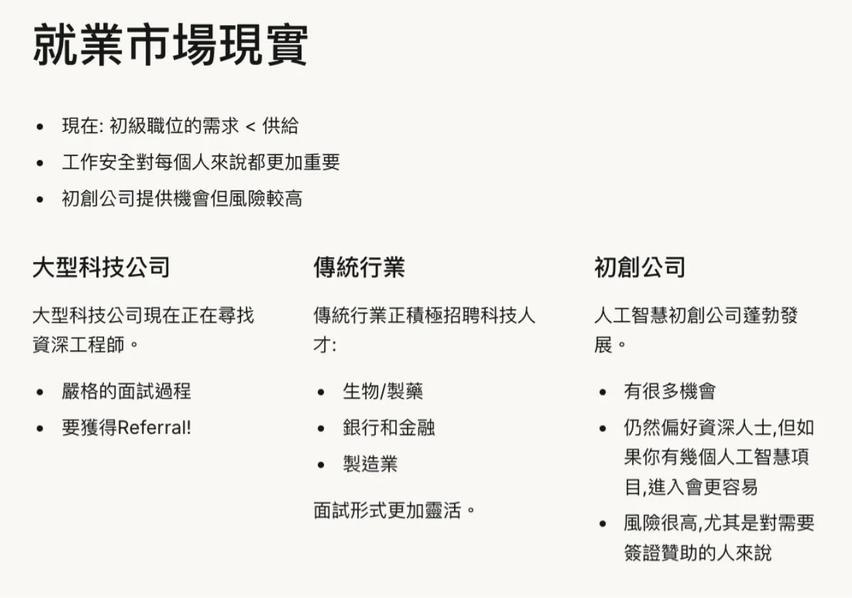 • 職位多為支援角色:即使進入大公司,許多職位偏向 Support Role,難以參與決策,許多從業者感受到的是「螺絲釘感」。